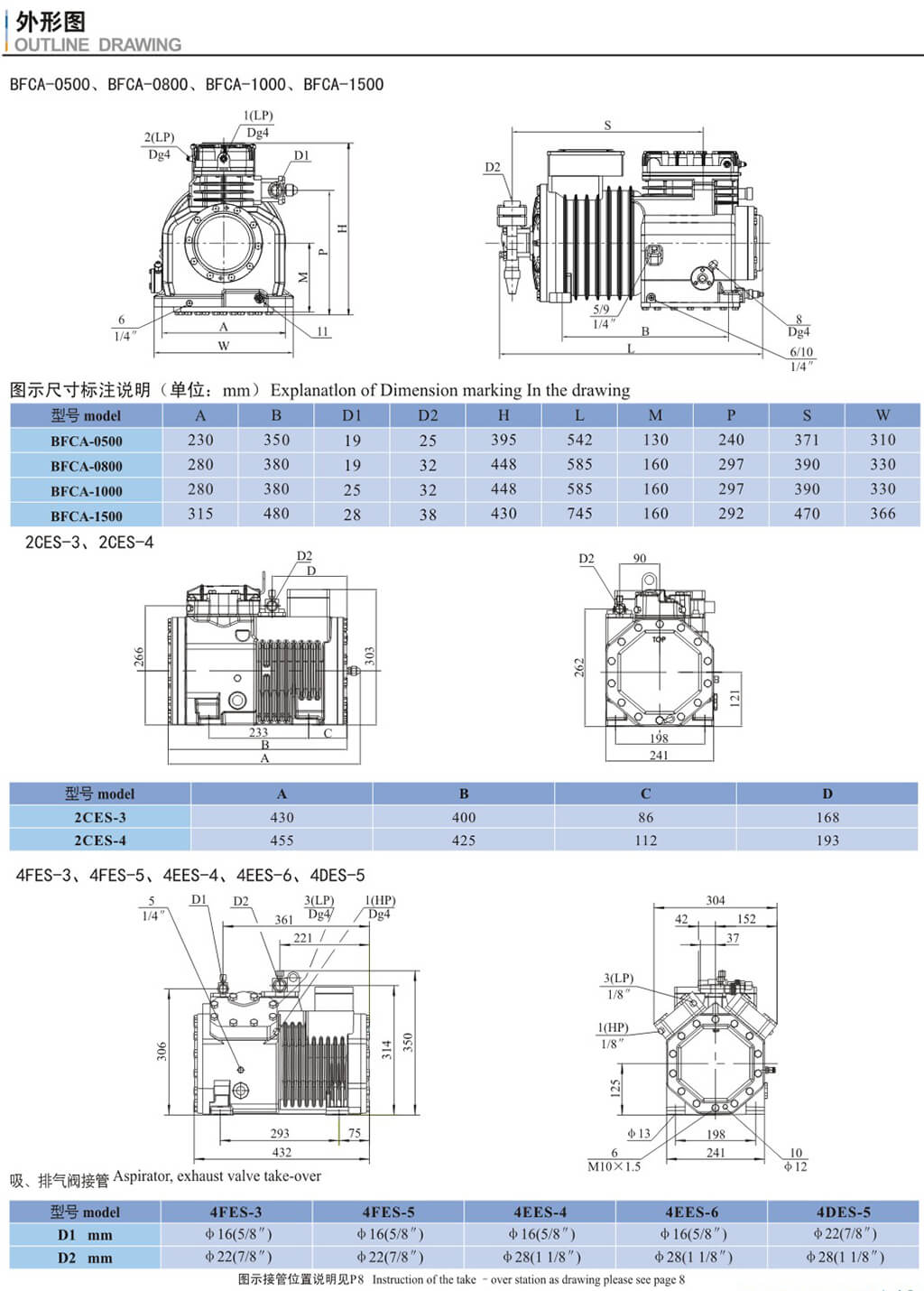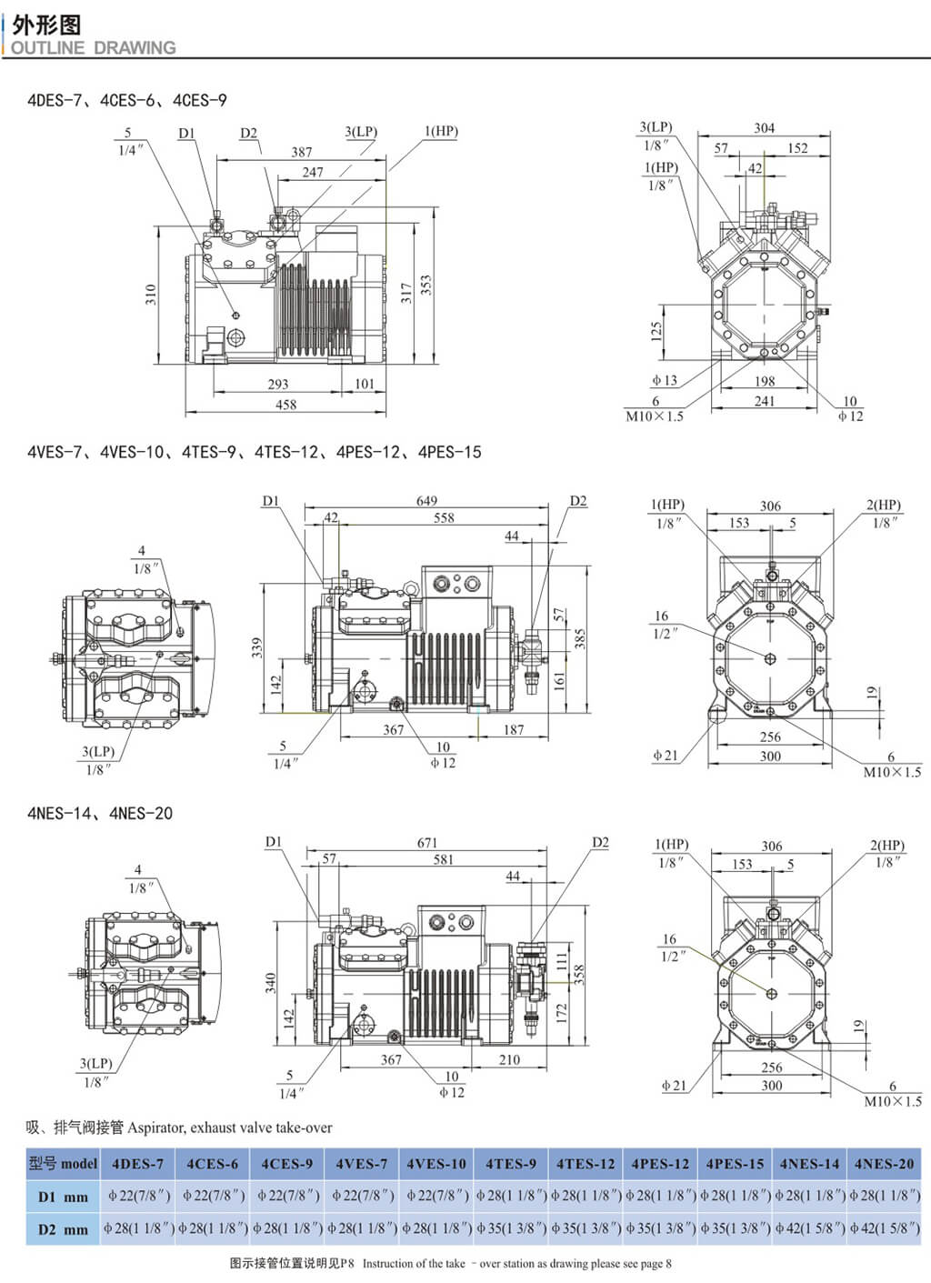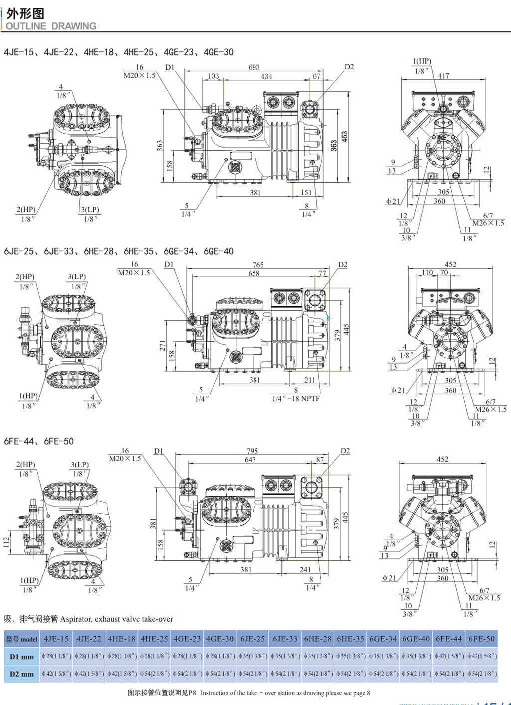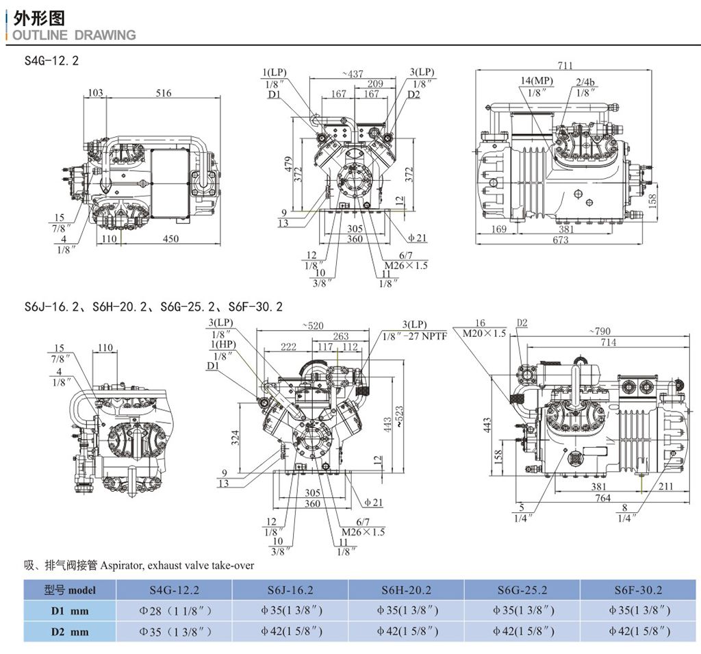 15.噴液口(不帶液體過(guò)冷器。熱力即脹閥運(yùn)行) 16.油壓差開(kāi)關(guān)"Dlta-P"連接 17.液體過(guò)冷器制冷劑入口 18、液體過(guò)冷器制冷劑出口 19.熱力膨脹資外平衡管接口(帶液體過(guò)冷器運(yùn)行) DI.排氣閥接口 D2、吸氣閱接口 |